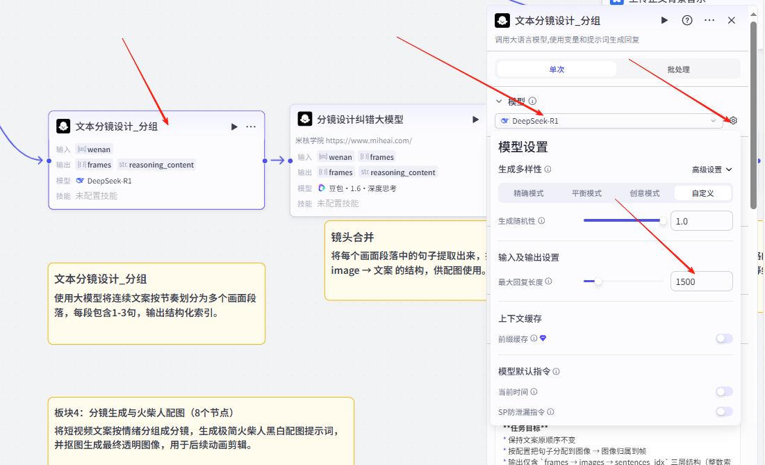 如果,你们不想要大模型生成的文案,想自己输入文案。但是自己文案太长。导致大模型输出截断。需要自己将大模型换成deepseek R1 后,在高级设置这里进行修改参数。并将最大回复长度按照自己需求变大。​